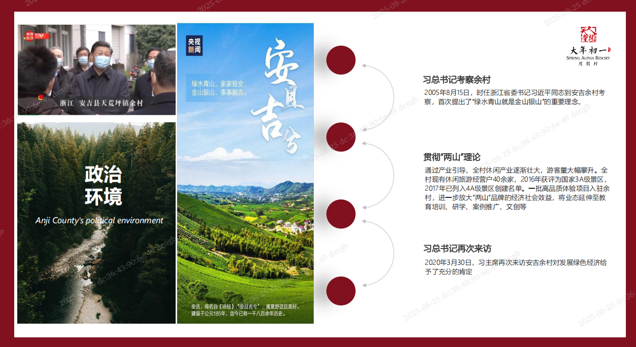 自2015年开业至今已10年,2005年8月15日,时任浙江省委书记的习近平总书记到浙江安吉余村考察,提出“绿水青山就是金山银山”的理念,余村是两山理论的发源地,呈现出生态经济和乡村振兴的壮美画卷,让人深刻感受到红色基因如何赋能绿色发展,引领中国乡村走向现代化的光辉前景,因此余村成为红色旅游、党建培训的基地。
